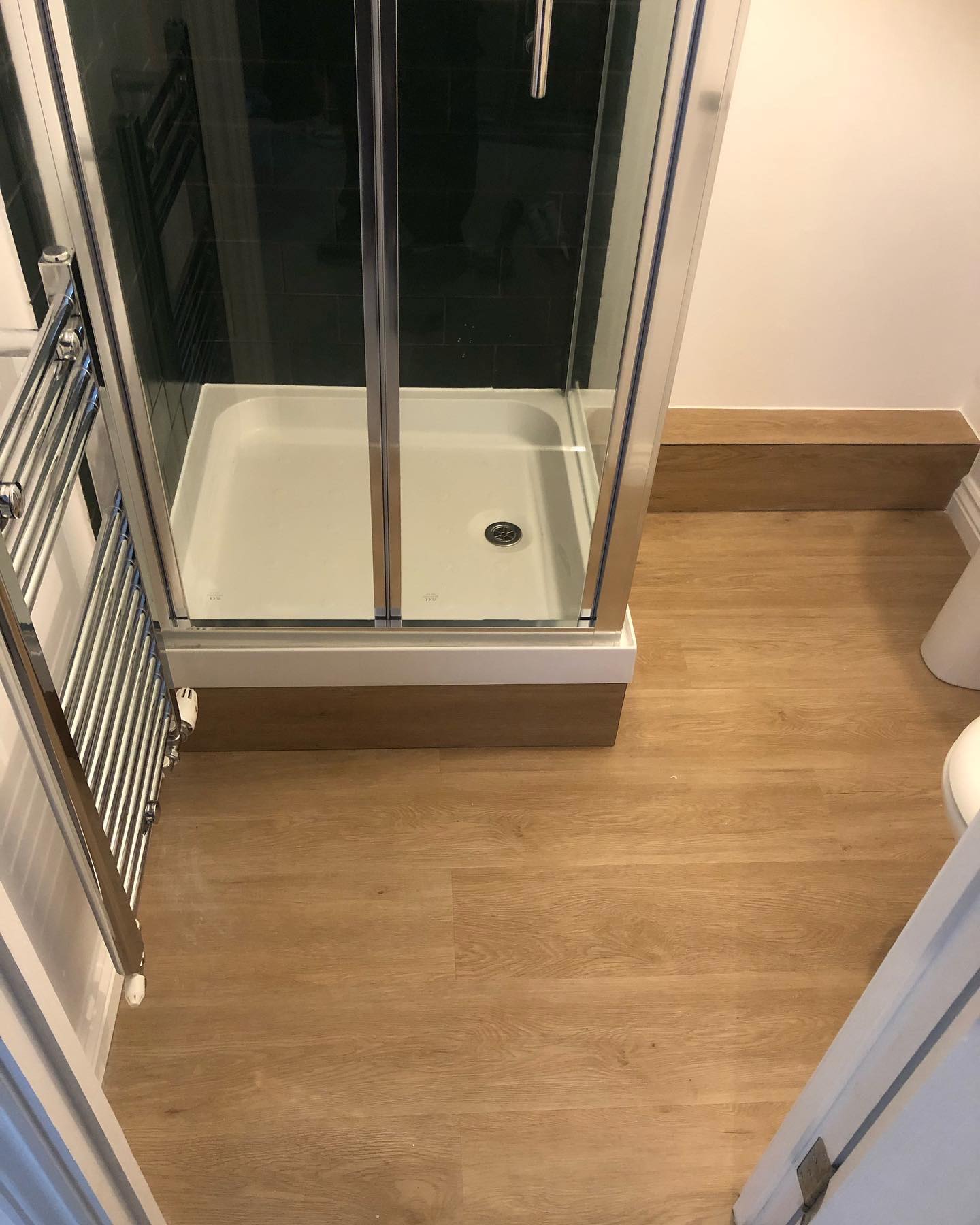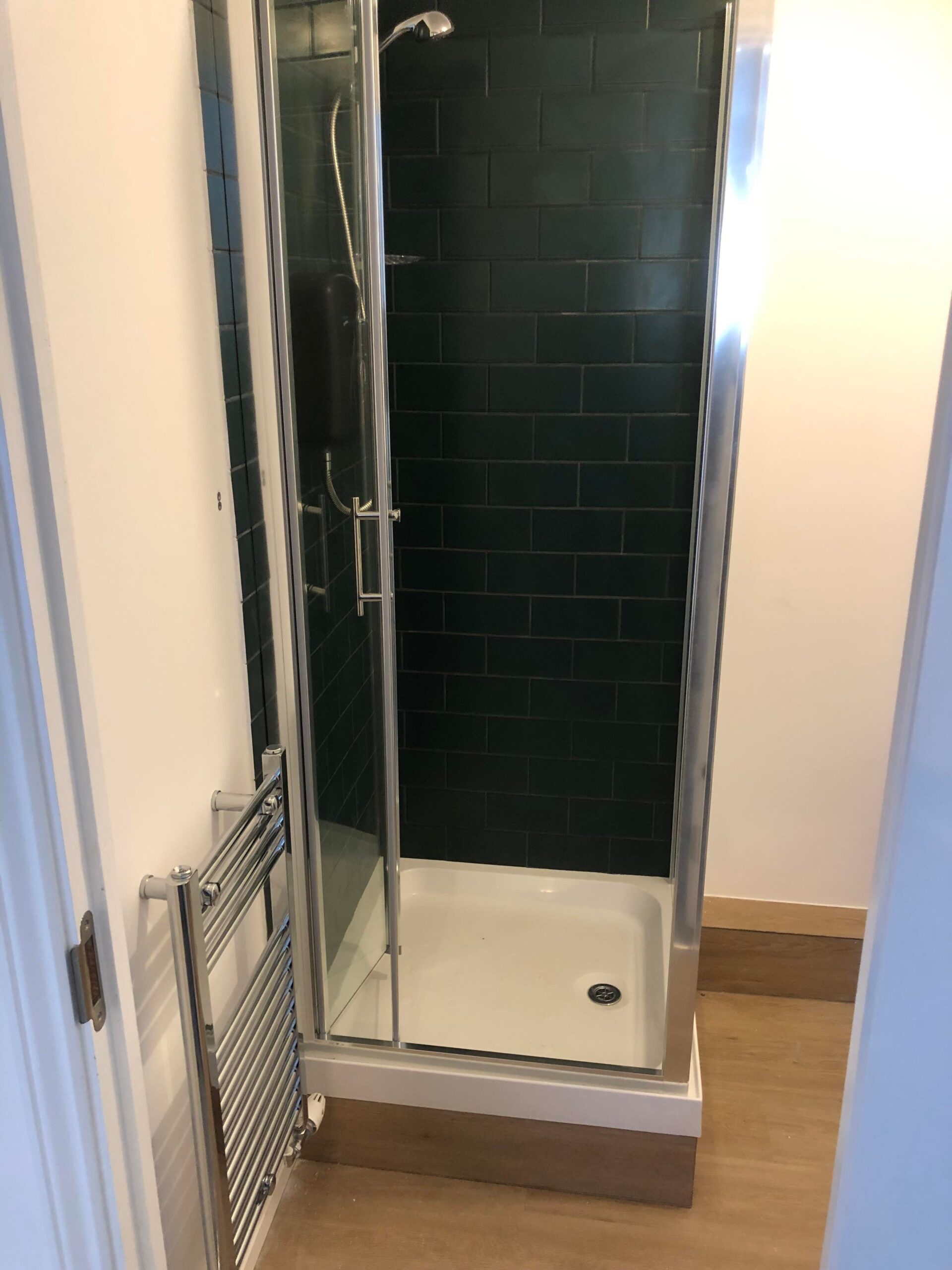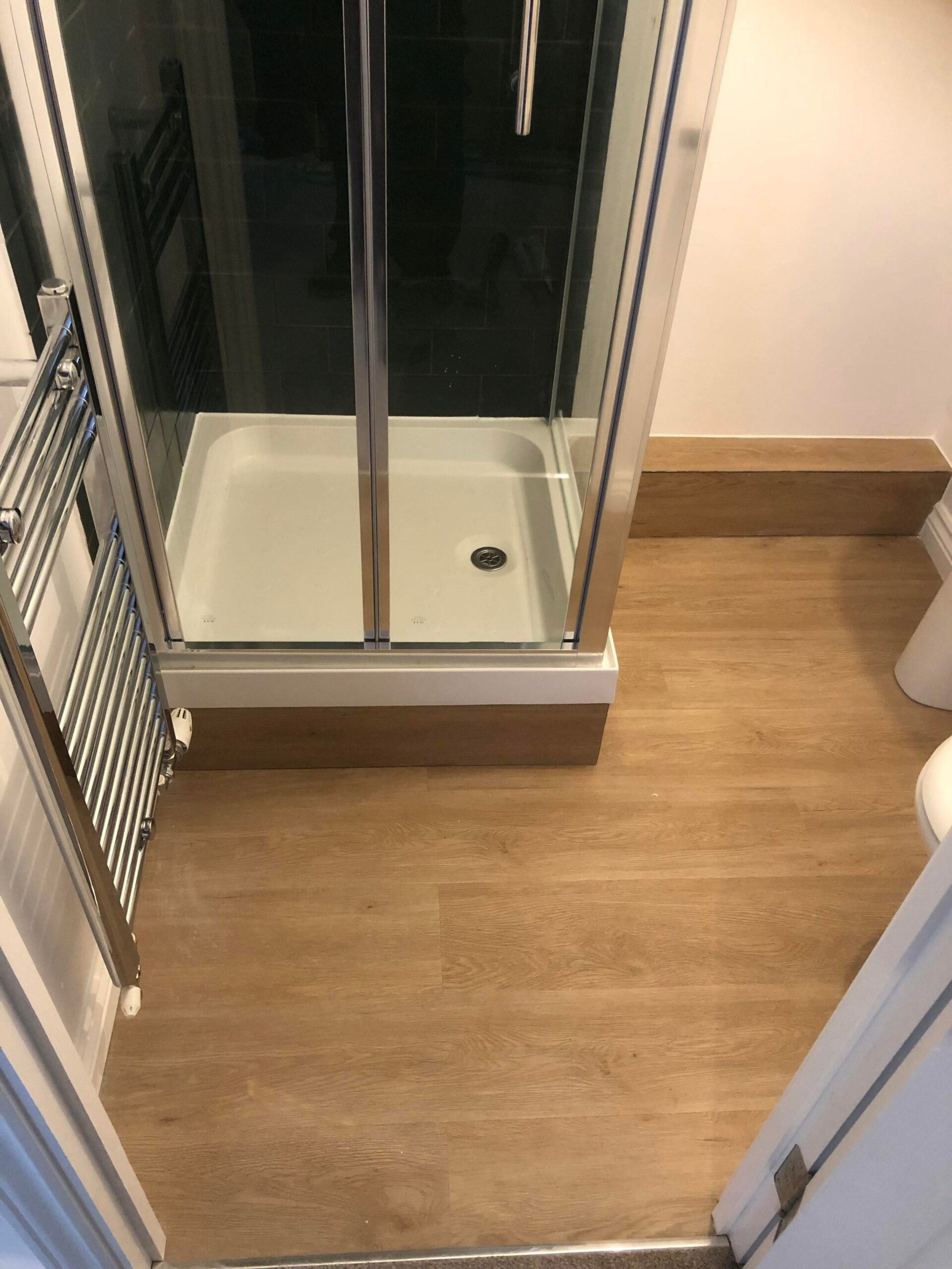 The old shower has been removed and replaced with a new one. Additionally, our team did full tiling and painting of the entire bathroom and the new LVT floor.