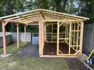 Next to the shed, we built a roofed area that adds significant practical value. This covered space can be used for: