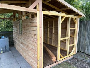 This project focused on creating a bespoke larch shed with an additional covered roof area, designed to provide both secure storage and a practical sheltered space within the garden.