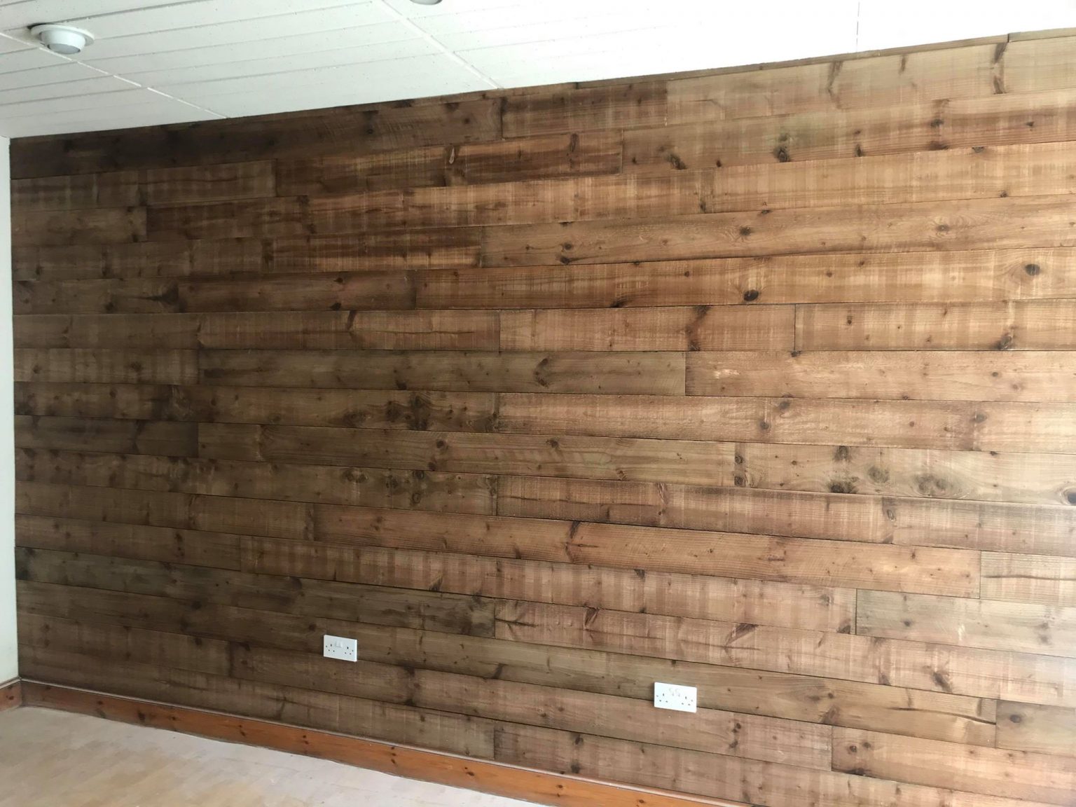 The beautiful and stylish wall incredibly refreshed the old interior and gave it a new, modern style. In this project, an oak worktop and vintage cabinets will be used to store hair styling accessories. As usual, our team used high quality impregnated brown wood from a sawmill to build the wall.
